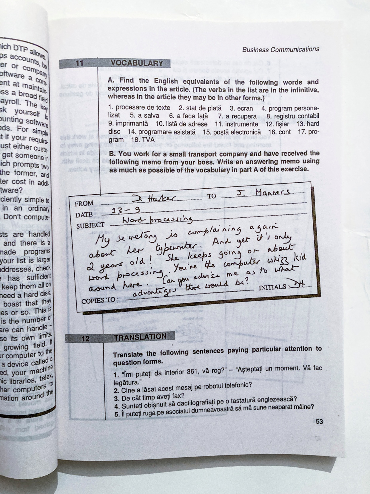 – Un set bogat de exerciții și lucrări practice tratează toate aspectele legate de limbaj, cu accent pe îmbogățirea vocabularului, traducerea textelor de specialitate, redactarea corespondenței și exprimarea orală în diferite situații concrete.