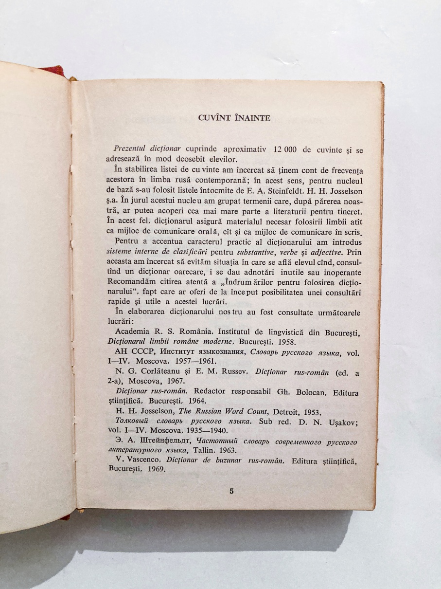 Prezentul dicționar cuprinde aproximativ 12 000 de cuvinte și se adresează în mod deosebit elevilor. În stabilirea listei de cuvinte am încercat să ținem cont de frecvența acestora în limba rusă contemporană; în acest sens, pentru nucleul de bază s-au folosit listele întocmite de E. A. Steinfeldt, H. H. Josselson ș.a. În jurul acestui nucleu am grupat termenii care, după părerea noastră, ar putea acoperi cea mai mare parte a literaturii pentru tineret. În acest fel, dicționarul asigură materialul necesar folosirii limbii atât ca mijloc de comunicare orală, cât și ca mijloc de comunicare în scris.