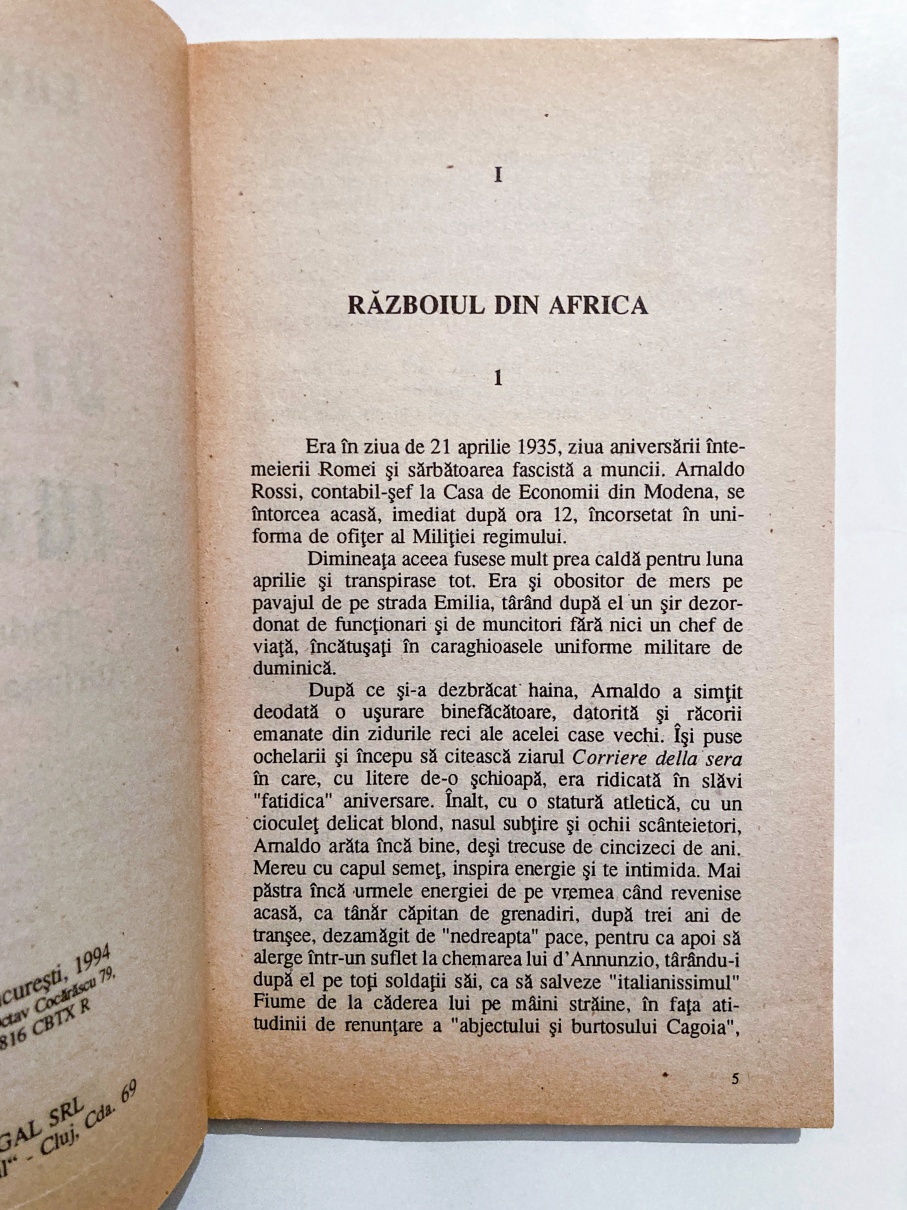 În această carte un celebru scriitor italian contemporan prezintă destinul implacabil al unui om prins în vârtejul epocii sale, marcată de ascensiunea și apoteoza unui curent aparent de nestăvilit.