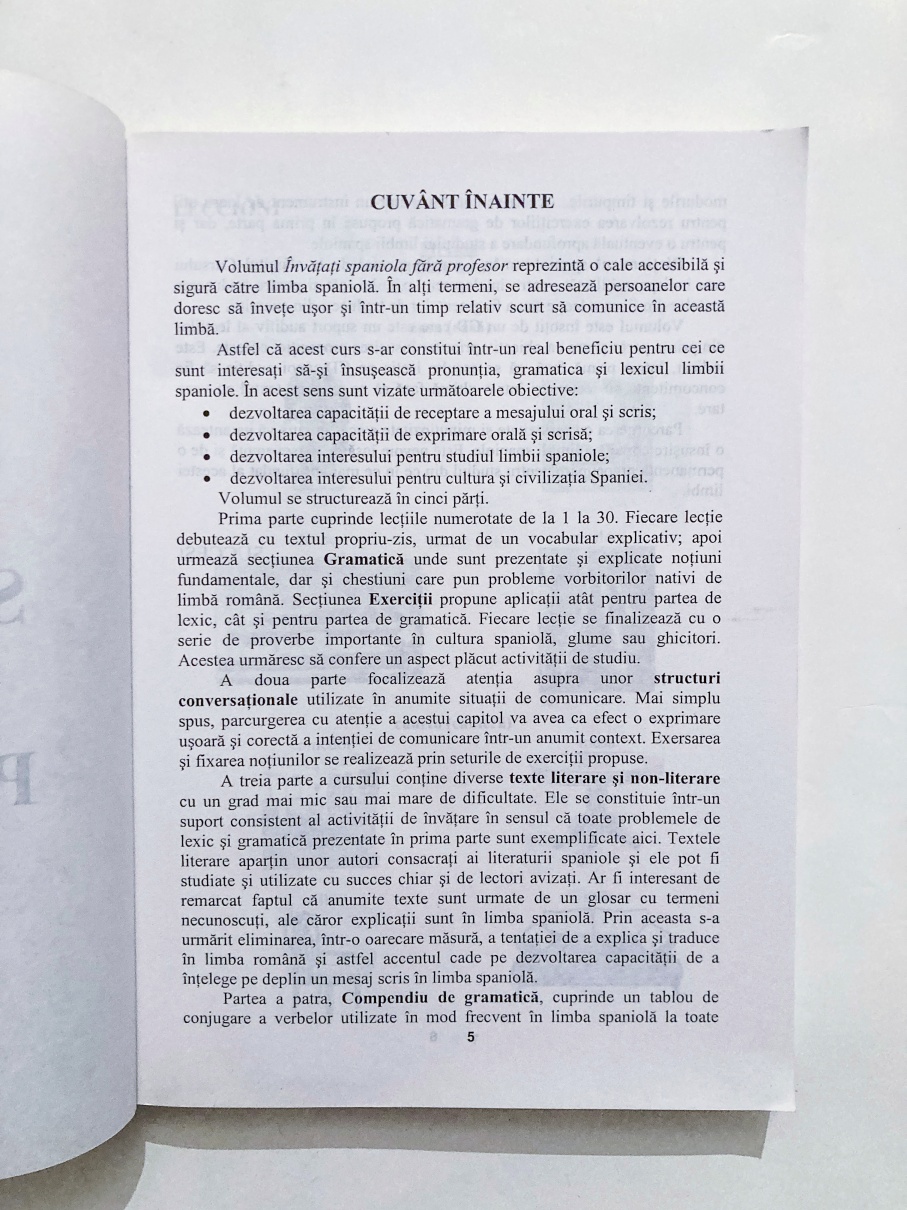 Volumul Învățați spaniola fără profesor reprezintă o cale accesibilă și sigură către limba spaniolă. În alți termeni, se adresează persoanelor care doresc să învețe ușor și într-un timp relativ scurt să comunice în această limbă.
