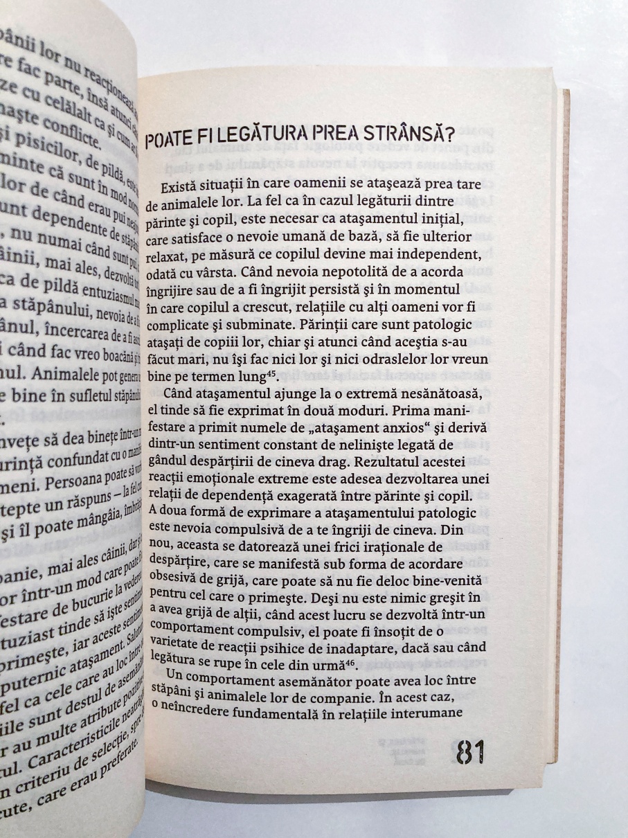 „Animalele de companie ne oferă beneficii însemnate în ceea ce privește sănătatea noastră mentală. Ele ne oferă sprijin emoțional și ne pot ajuta să micșorăm stresul și nemulțumirea. Ba mai mult, având capacitatea de a ne dărui confort și stabilitate, animalele de companie au ajuns să fie folosite cu succes ca o formă adițională de terapie în cazul anumitor probleme psihice și comportamentale.”